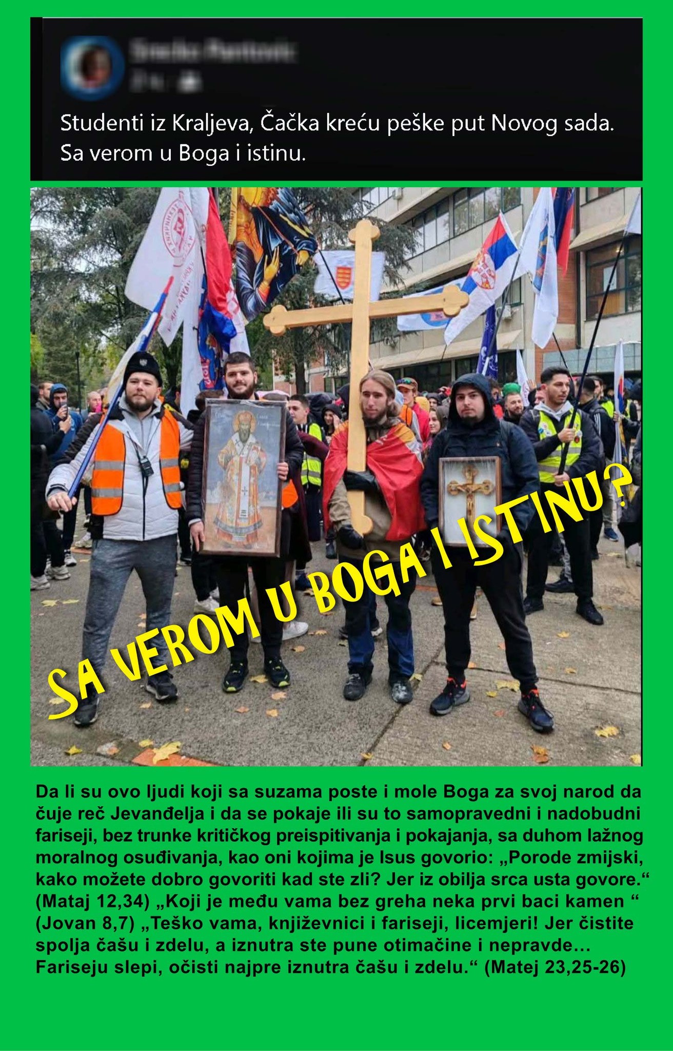Ustali su protiv nekvalifikovanih kadrova koji su izvazvali nesreću u Novom Sadu, a sami sprečavaju studiranje onih svojih kolega koji vole da studiraju i kojima je cilj kvalifikacija. Ustali su protiv korupcije, a sami varaju na ispitima, pokazujući isti karakter pokvarenosti koji će se sutra manifestovati kroz korupciju i svaku drugu prevaru. Ustali su protiv mafijašenja, a sami neće da prijave kolege koji varaju na ispitima jer su sami robovi sujetnog odobravanja drugih, zbog kojeg se i formiraju mafijaški klanovi. Ustali su protiv jednoumlja i diktature u štampi i društvenim medijima, a sami kidišu na plenumima na svakoga ko im iznese drugačije mišljenje. Oterali su sve neistomišljenike, a svoje skupove i dalje nazivaju plenumima. Nema netolerantnijih ljudi od njih, nesposobnih da čuju kritičko mišljenje, a zameraju vlastima na neslobodi mišljenja. Kao rezultat najgore vaspitane generacije dece, krenuli su u školu sa velikim razmaženim Egom koji doživljava kao atak na ličnost svaki razuman nalog života, svaku životnu odgovornost pa i samo učenje. Zato uče sve kao od bede i ne mogu da prate nastavu duže od par desetina minuta, da se zbog njih snižavaju zahtevi i standardi nastave. I dok su tako sami neodgovorni, oni druge licemerno nazivaju ćacijevcima, i zameraju vlastima na neodgovornosti kao da neodgovornost nije odlika i njih samih i većine samog naroda, bez obzira na stranačko opredeljenje! Oni koji su kukavice da osude zlo u sopstvenim redovima, jer se boje da izgube odobravanje ostalih, pokazuju buntovnu hrabrost da osude isto zlo u vlasti. Nespremni da u postavljanju pitanja odgovornosti krenu od sebe samih, oni upiru prst na onog drugoga i svaljuju svu odgovornost za nesreću u društvu na postojeću vlast. Zato se i njima mogu uputiti reči koje je Isus Hristos uputio farisejima: “Koji je među vama bez greha neka najpre baci kamen.” (Jovan 8,7)